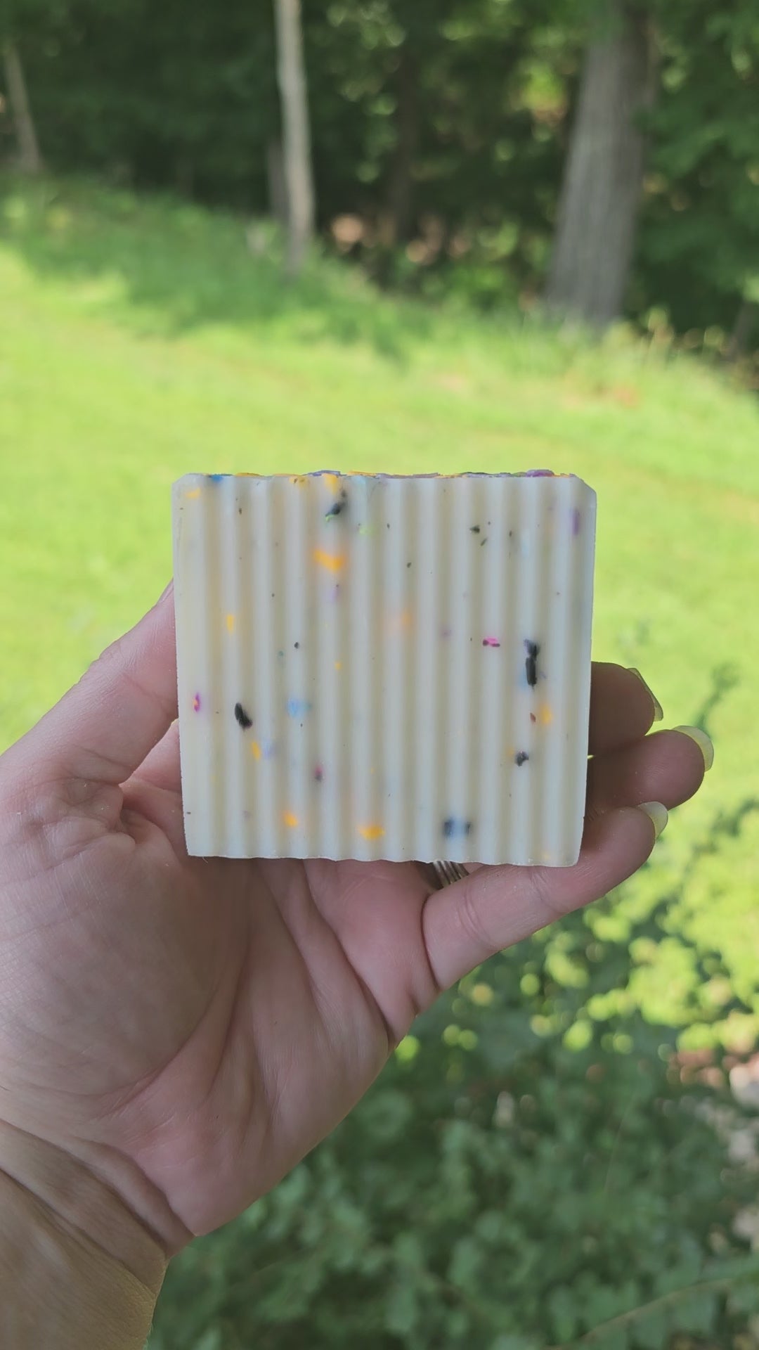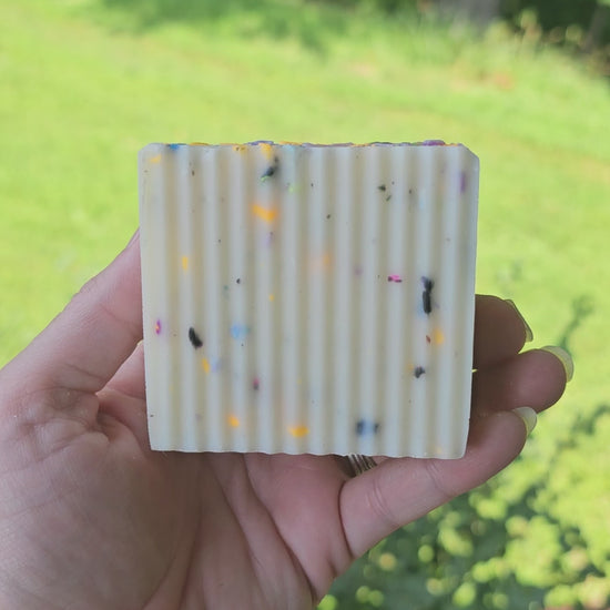 **Fun fact, this soap will always have different colored "confetti" flecks in it! This soap allows us to use soap scraps, which makes for all kinds of different colored "confetti." But the best part? Using the soap scraps means that we use every bit of soap we make with nothing being thrown away! We love trying to reduce our waste as much as possible, and it creates a beautiful looking soap in the process! We definitely consider this one a win-win!